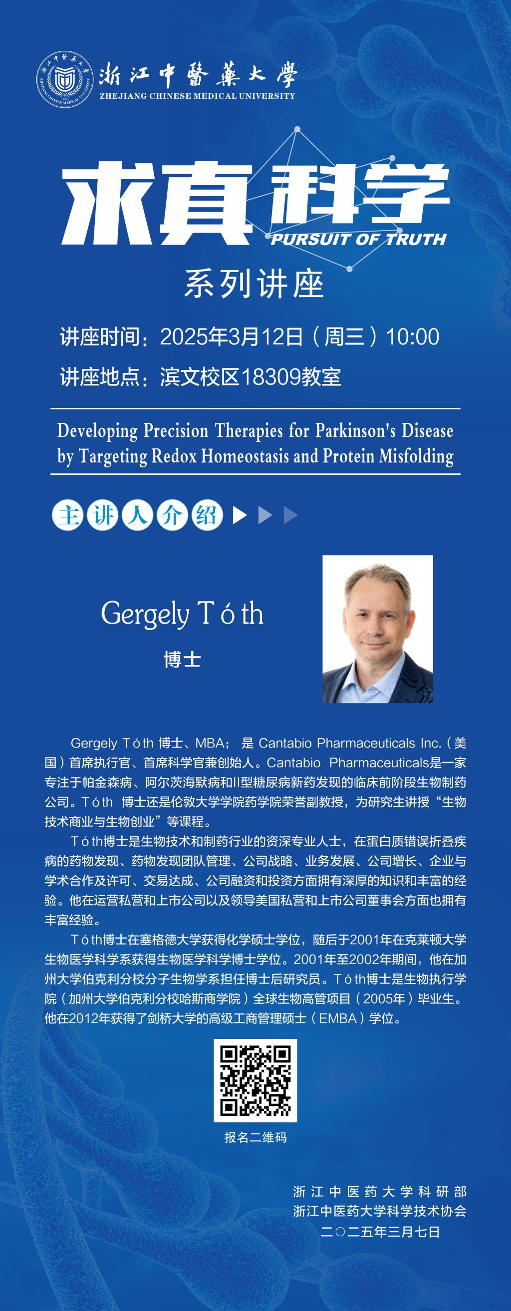 为提升科研创新能力和科学素养,拓展学术领域,营造我校科研学术氛围,学校邀请Cantabio Pharmaceuticals首席执行官、首席科学官兼创始人Gergely Tóth 博士现场讲座,主题为:Developing Precision Therapies for Parkinson's Disease by Targeting Redox Homeostasis and Protein Misfolding。现将有关事项通知如下: